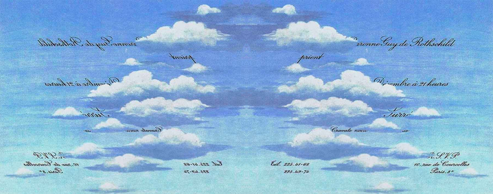 In his 1985 autobiography, The Whims of Fortune, Guy de Rothschild remembers that instead of a standard invitation, “in the winter of 1972, an invitation cut out of a sky painting by Magritte with strange hieroglyphics floating among the clouds must at first have mystified the people who received them. But when it occurred to them to read the text in a mirror, they learned that they were invited to a surrealistic dinner party at Ferrières on December 12.”