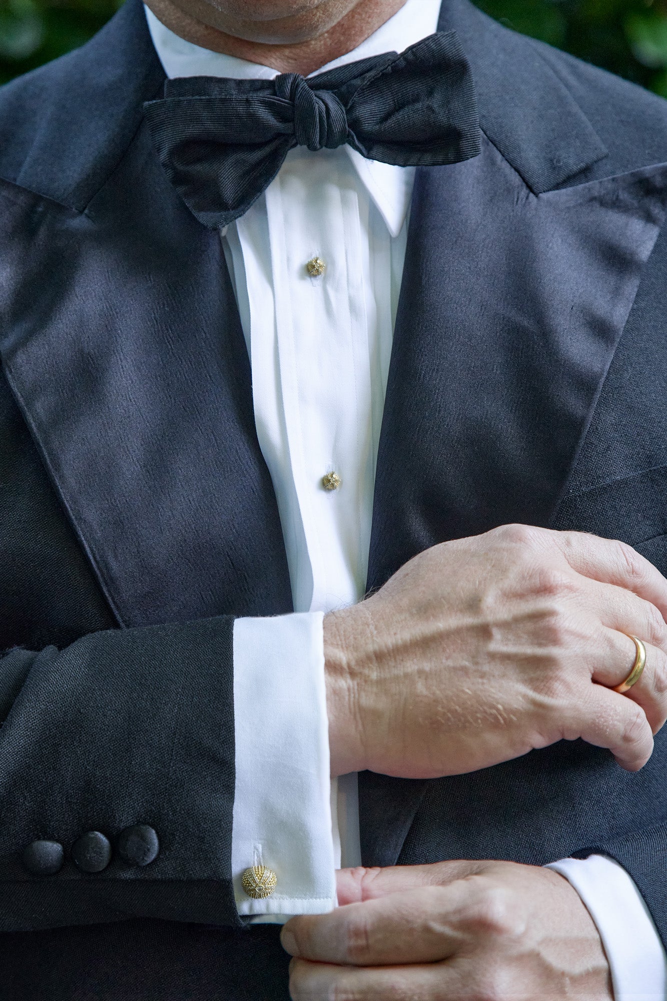 Each cufflink is two-sided, with a smaller sea urchin that is designed to fit through the button-hole and is attached to the other with an intricate handmade chain that allows your cuffs to hang comfortably on your wrist.