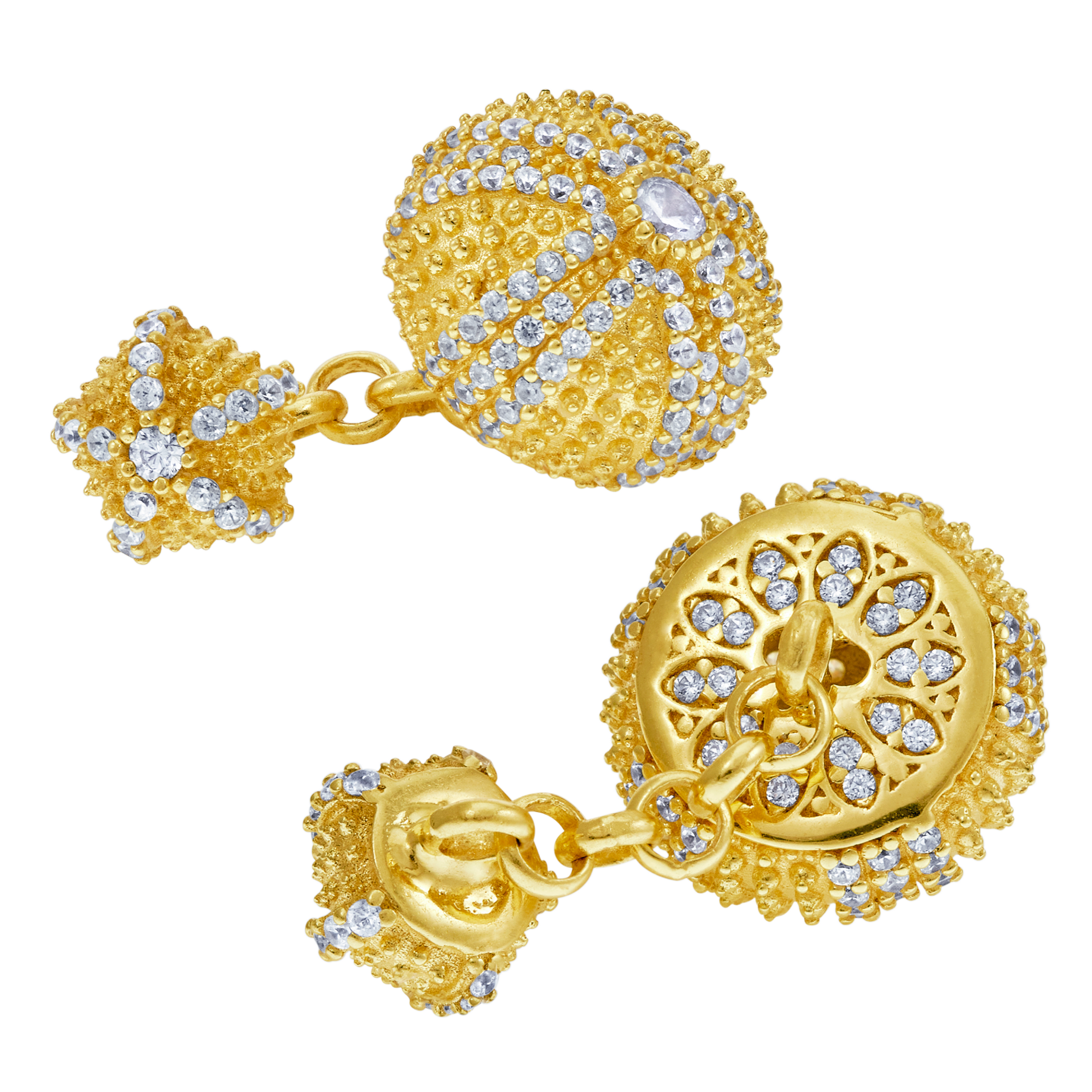 Each cufflink is two-sided, with a smaller sea urchin that is designed to fit through the button-hole and is attached to the other with an intricate handmade chain that allows your cuffs to hang comfortably on your wrist.