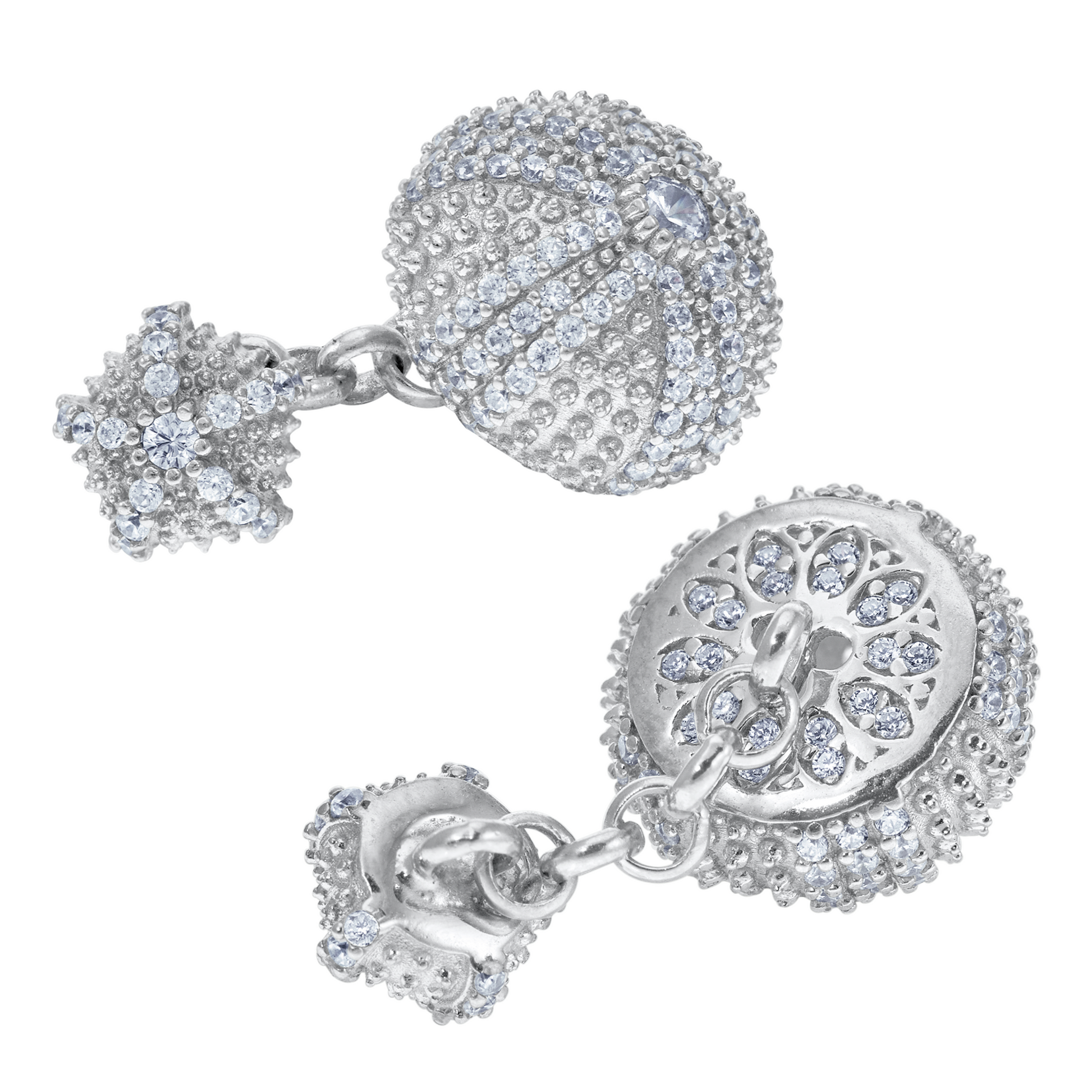 Each cufflink is two-sided, with a smaller sea urchin that is designed to fit through the button-hole and is attached to the other with an intricate handmade chain that allows your cuffs to hang comfortably on your wrist.