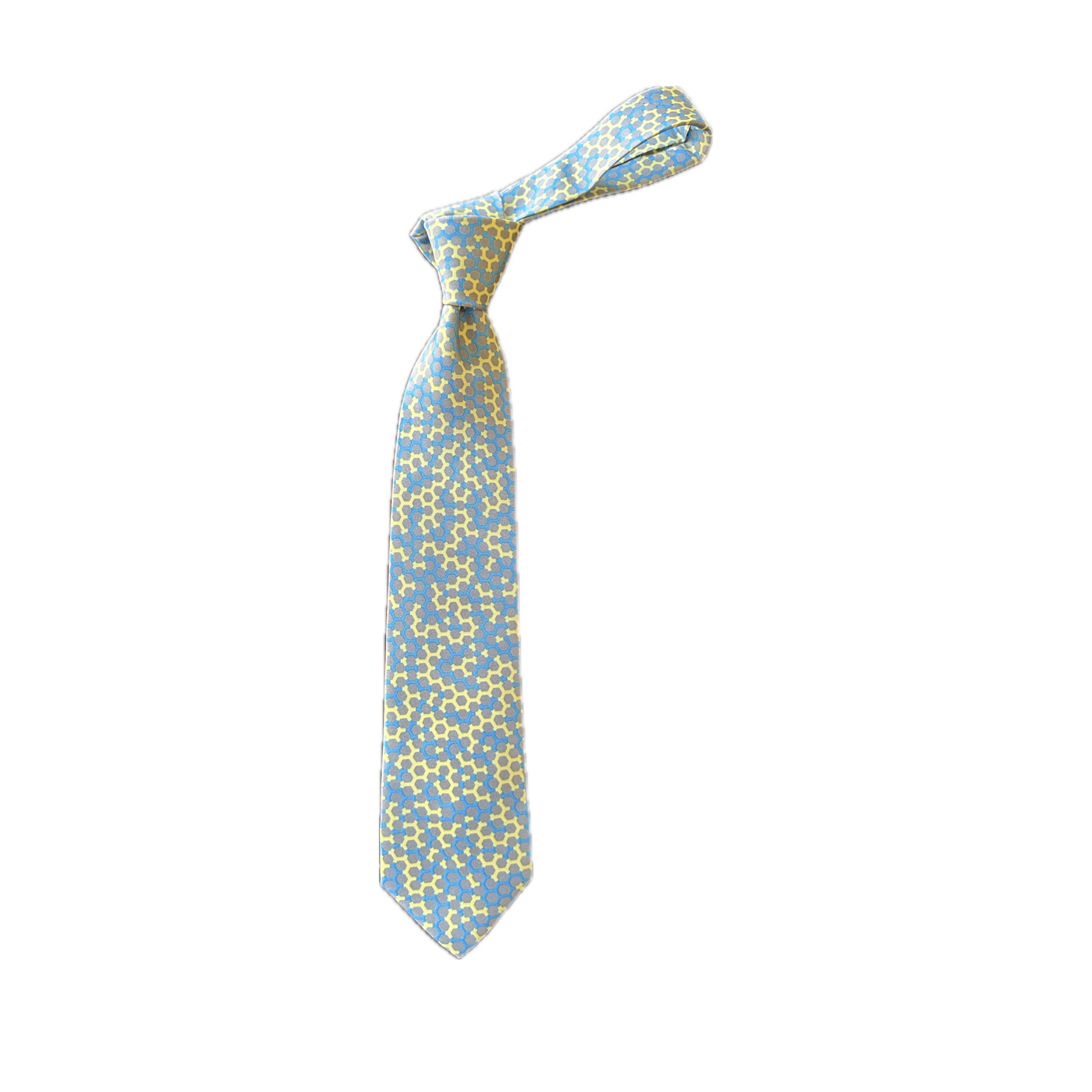 Verdant Geometric Hexagonal Silk Tie Designed by Laurinda Spear in Taupe, Blue and Yellow